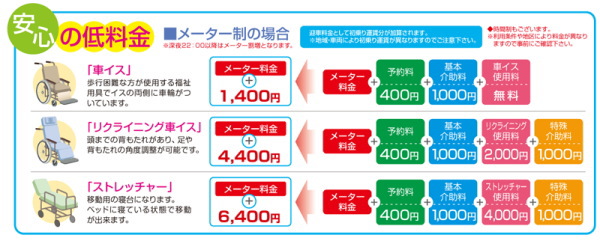 また、介護タクシーでは時間帯でも料金が変わってきます。23時から翌朝5時までがだいたいの夜間の適用時間帯になり、2~3割増しの事業所が多いようです。